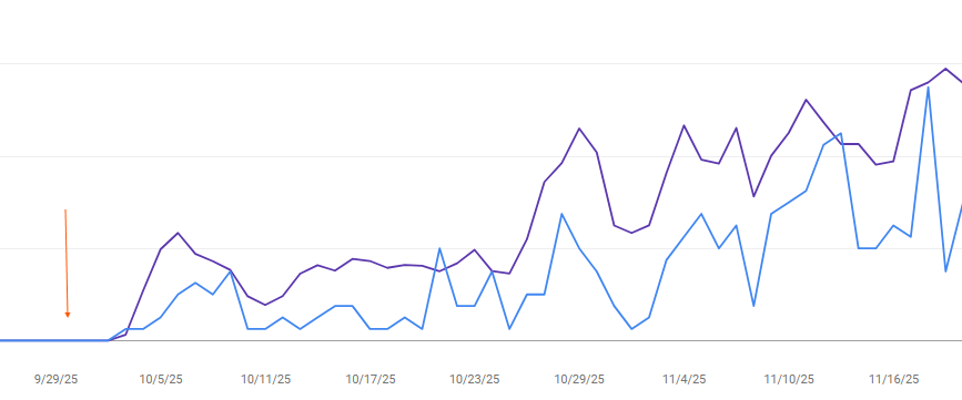 以下是我们最近为一位客户发布的一篇文章在 Google Search Console 中的数据。该文章围绕一个长期热门、已有大量竞争页面在排名的主题展开。