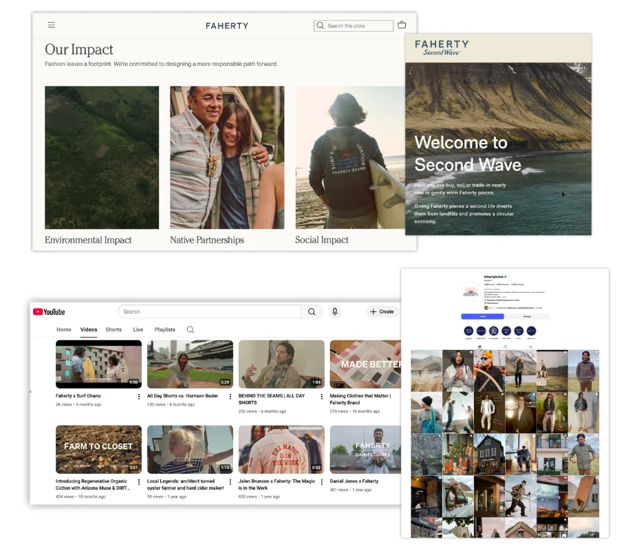 家族经营的服装品牌 Faherty Brand 就是一个很好的示例。他们围绕可持续发展主题的内容同时出现在博客、YouTube 和 Instagram 上,不断强化同一个品牌故事。这种一致性构建了一个高度统一的线上形象,使 AI 系统能够轻松地将各个平台连接起来。