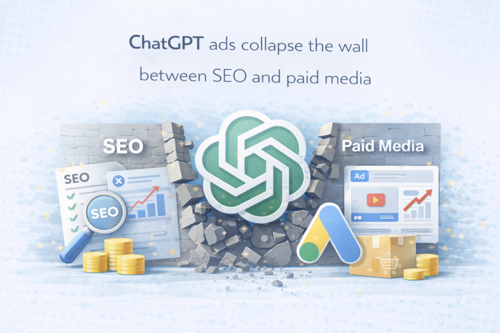 ChatGPT 广告预示着一场转变,迫使 SEO 与付费媒体围绕提示词智能(prompt intelligence)、扇出关键词(fanout keywords)以及 LLM 可见性进行协同。 长期以来,数字营销团队一直在争论 SEO 与 PPC 之间的平衡。关键词归谁?预算归谁?谁最能有效证明投资回报率(ROI)? 多年来,这种分工似乎界限分明。SEO 专注于优化自然排名,而付费媒体专注于竞价机制。双方都在同一结果页上争夺可见性,但其底层机制与激励逻辑却截然不同。 ChatGPT 广告正开始抹去这条界线。自然与付费之间的区隔不仅在模糊,更正在对话式 AI 中被打破。 新的战场不再是