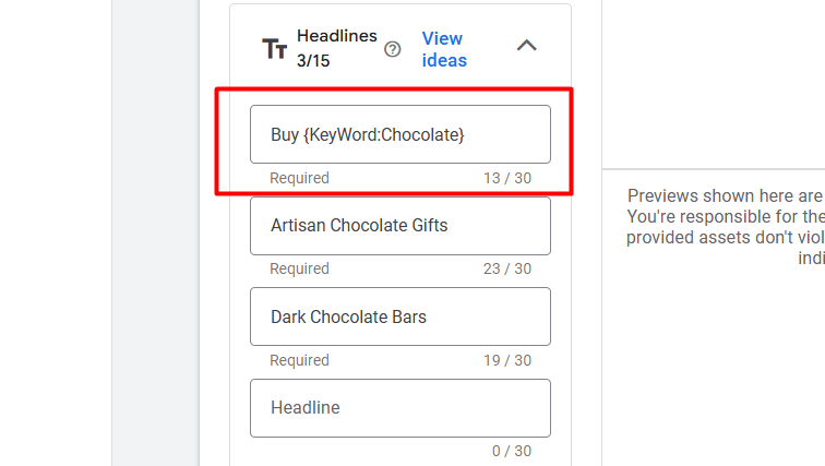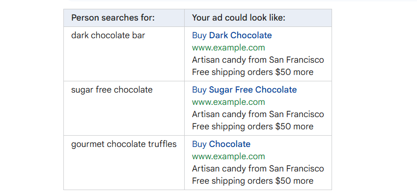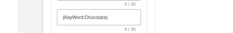 目标:Google Ads 会尝试用触发广告的关键词替换占位符({KeyWord:Chocolate})。
