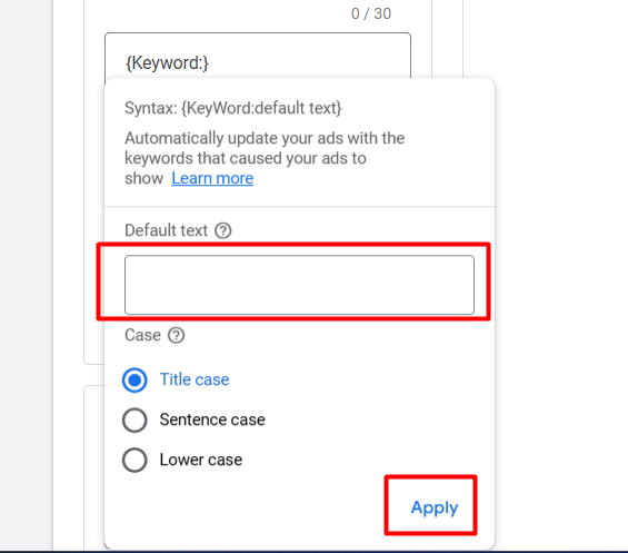 安全网(默认词):如果由于某种原因,Google Ads 无法插入相关的关键词——例如关键词太长,无法容纳在标题空间中,或者搜索的是你没有明确列出的内容——它将使用你在冒号后面设置的默认词。