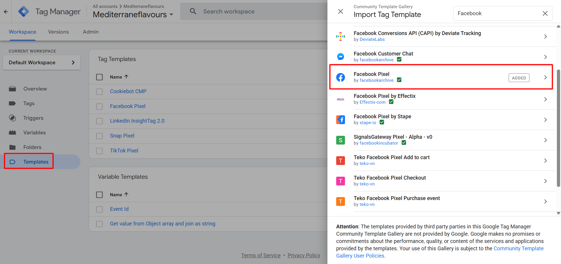 现在回到 GTM。要通过 GTM 将 Facebook Pixel 设置到您的网站,首先我们需要在工作区中添加一个模板。