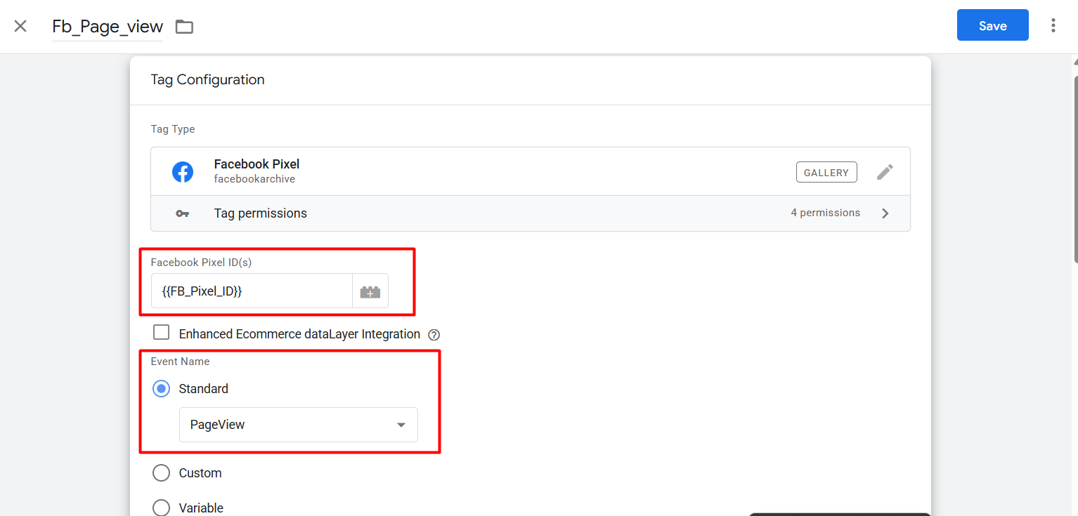 在这里,首先粘贴您的 Facebook Pixel ID,这是我们之前复制的。然后在接下来的“事件名称”部分,从标准事件中选择“PageView”作为事件。现在完成了。