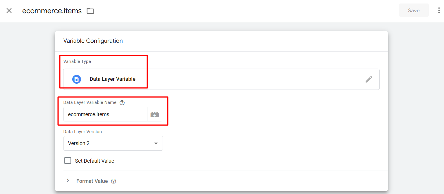 选择“数据层变量”作为变量类型,并按如下方式设置变量。现在记住变量名称,并创建另一个新变量,但这次选择“自定义 JavaScript”作为变量类型。