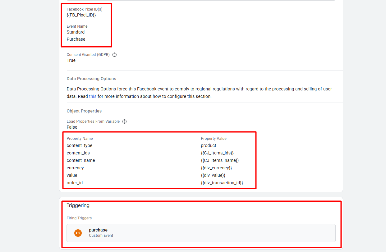 在这里,您可以看到我们是如何完成“Purchase”事件的标签设置的。通过“Purchase”事件,我们成功地完成了所有标准事件的设置,完成了 Facebook Pixel 的配置。