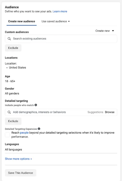 当你查看 Meta 广告中的受众控制(Audience Control)仪表盘时,会发现即便是在使用 Advantage+ 的情况下,你仍然可以通过多种方式进行手动受众定向。