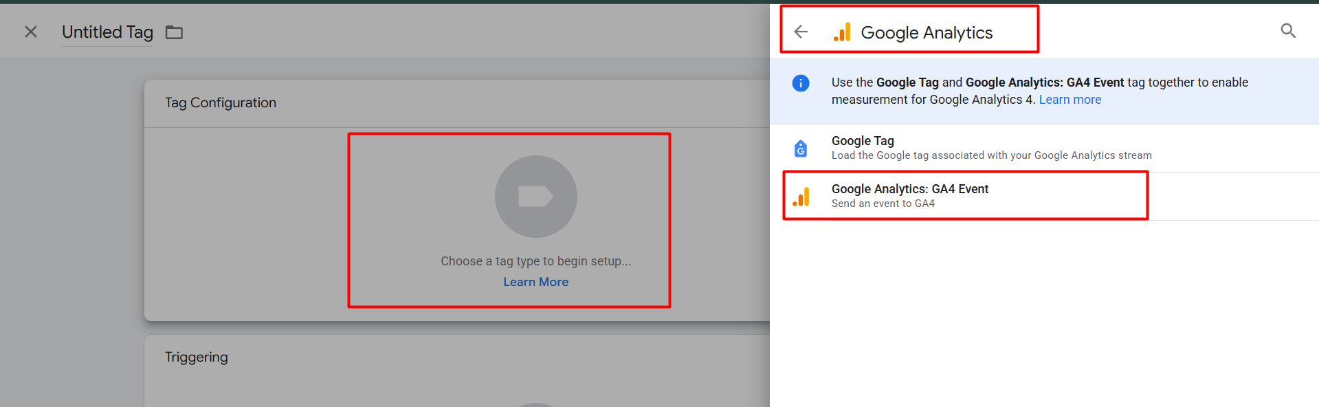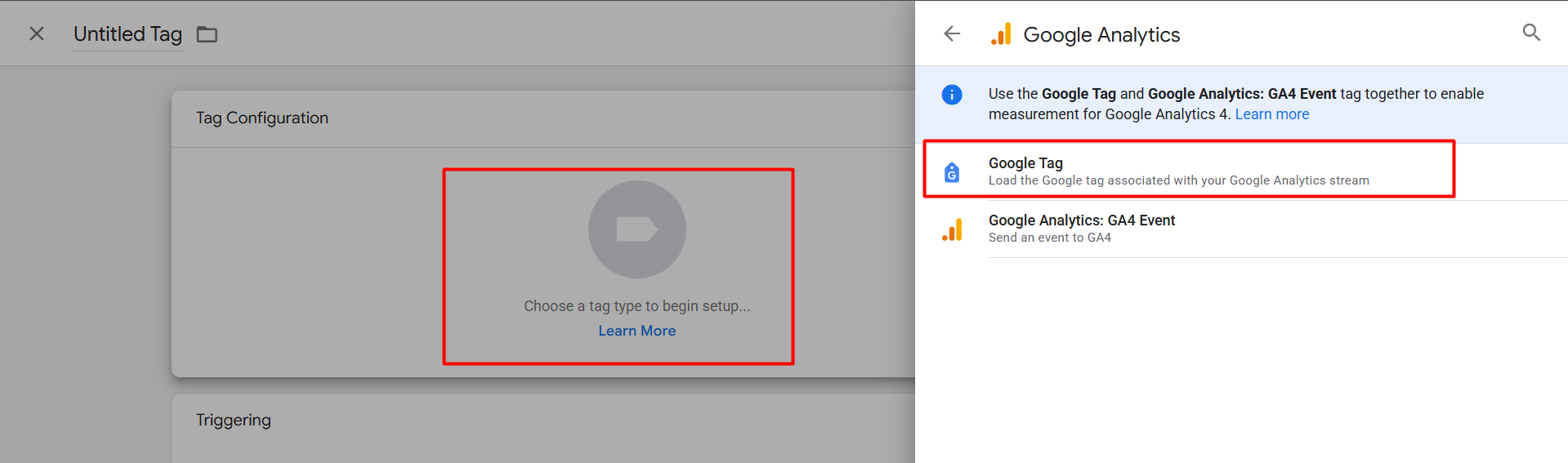 在这里,选择“Google 标签”作为您的标签类型。通过这个,我们将把数据从 Web 容器发送到服务器。