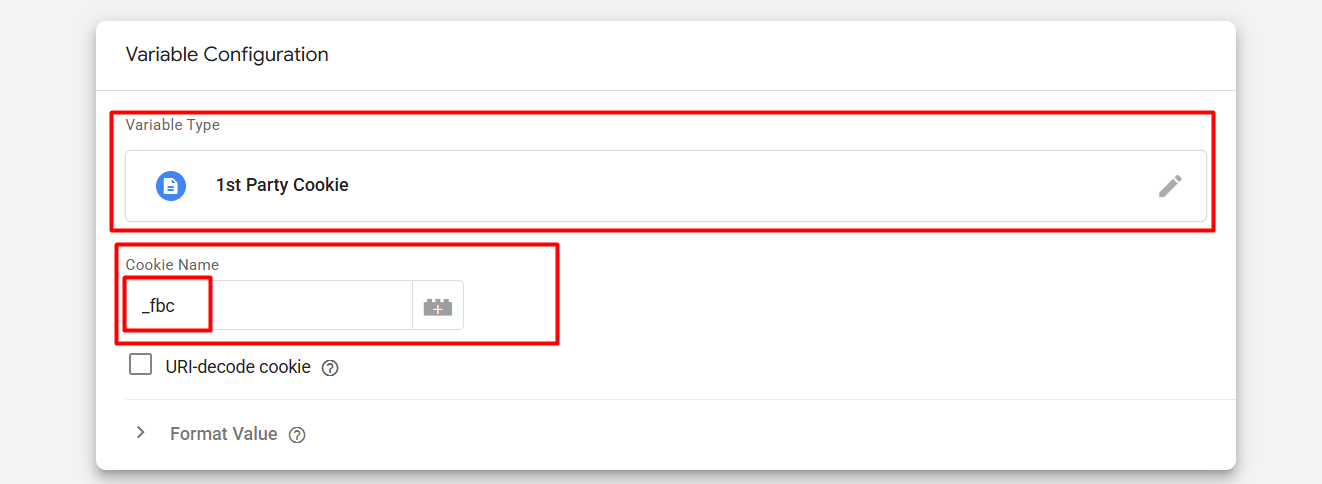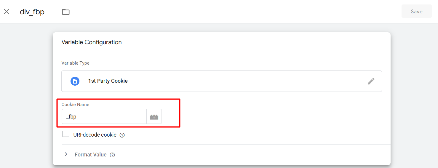 在这里,您可以看到我们是如何创建变量的。首先,从 GTM 变量部分选择“第一方 Cookie”作为我们的 cookie 类型。然后在“Cookie 名称”中填写值“_fbp”。您也可以按照相同的方法创建“fbp” cookie 收集器变量。
