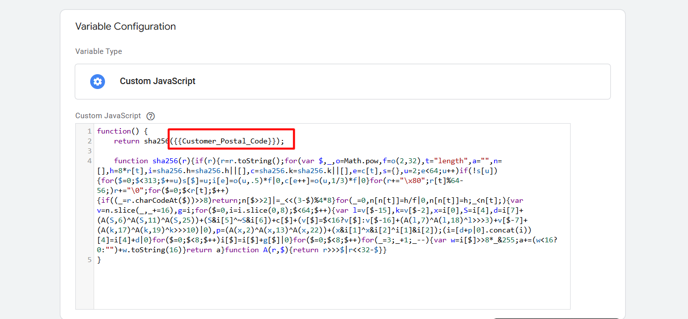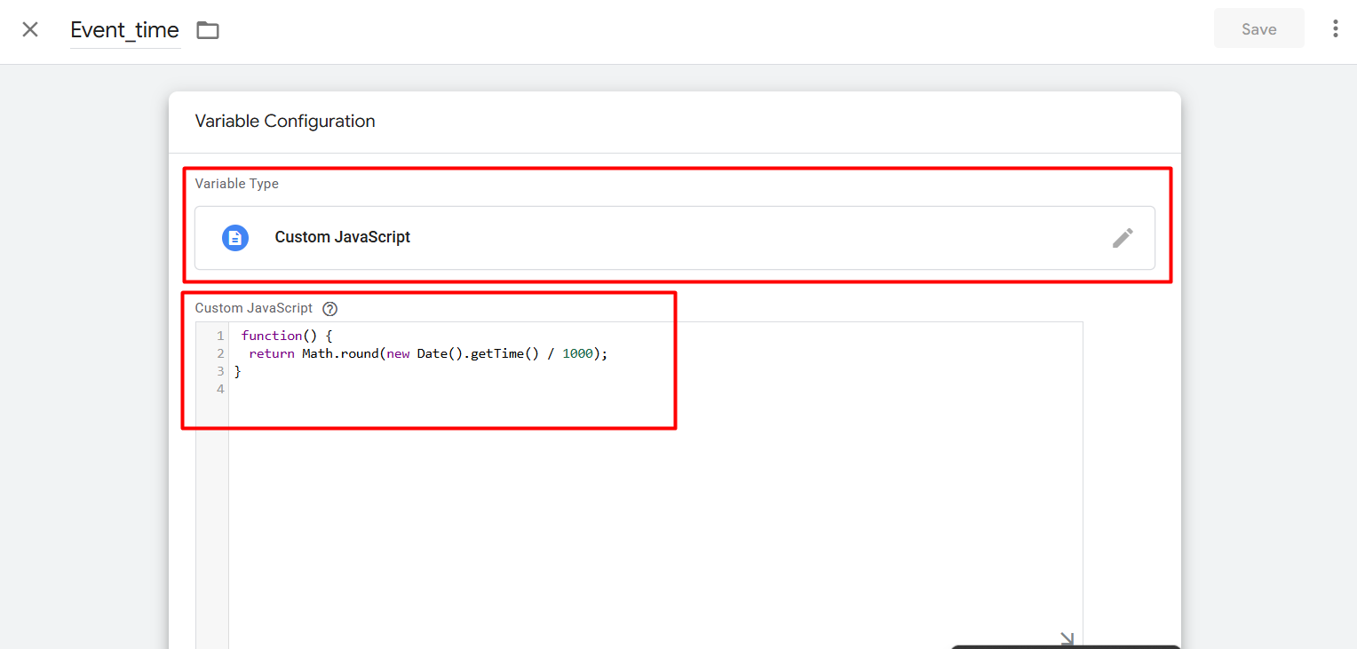 然后再次进入您的变量部分,选择“自定义 JavaScript”作为变量类型,并粘贴代码。