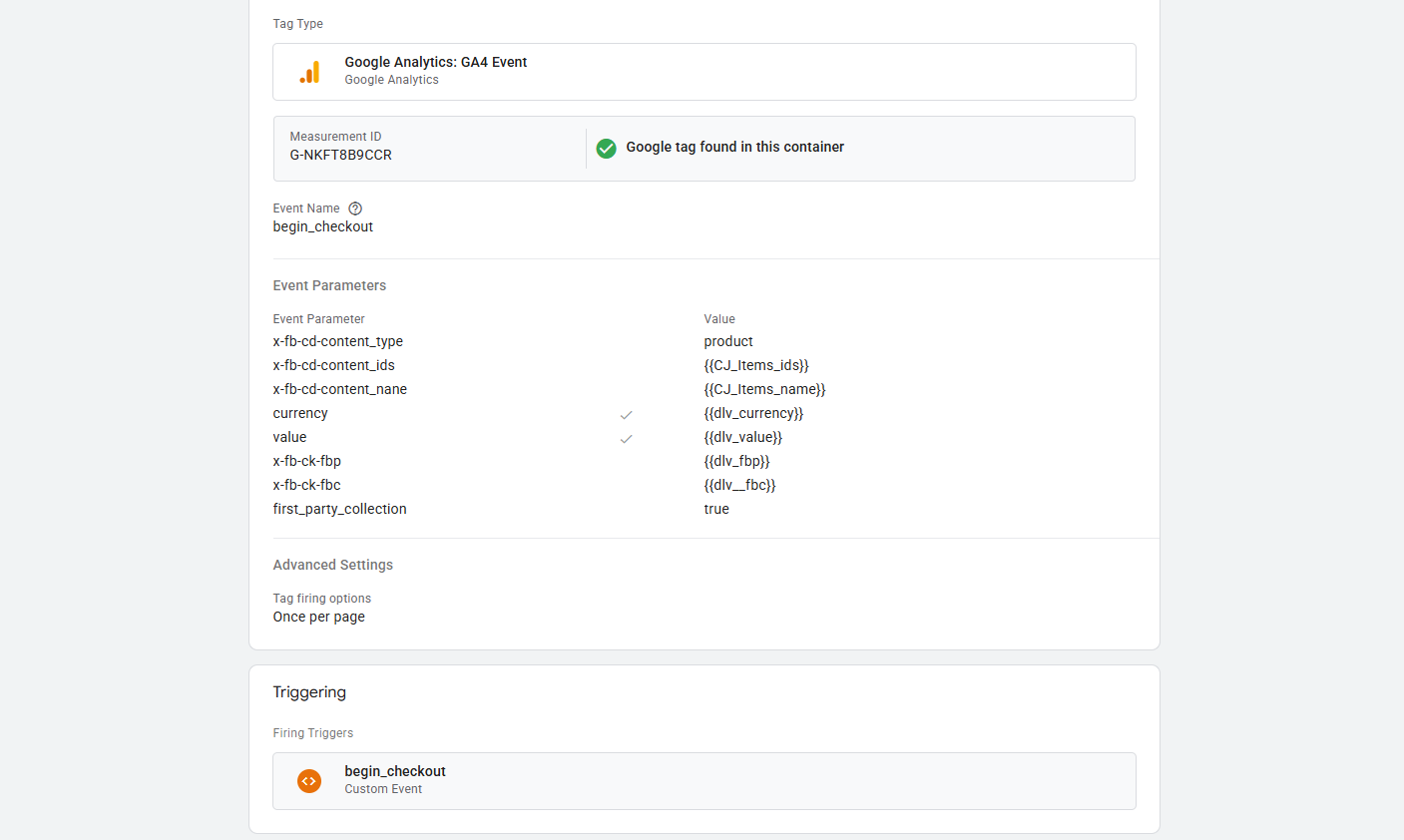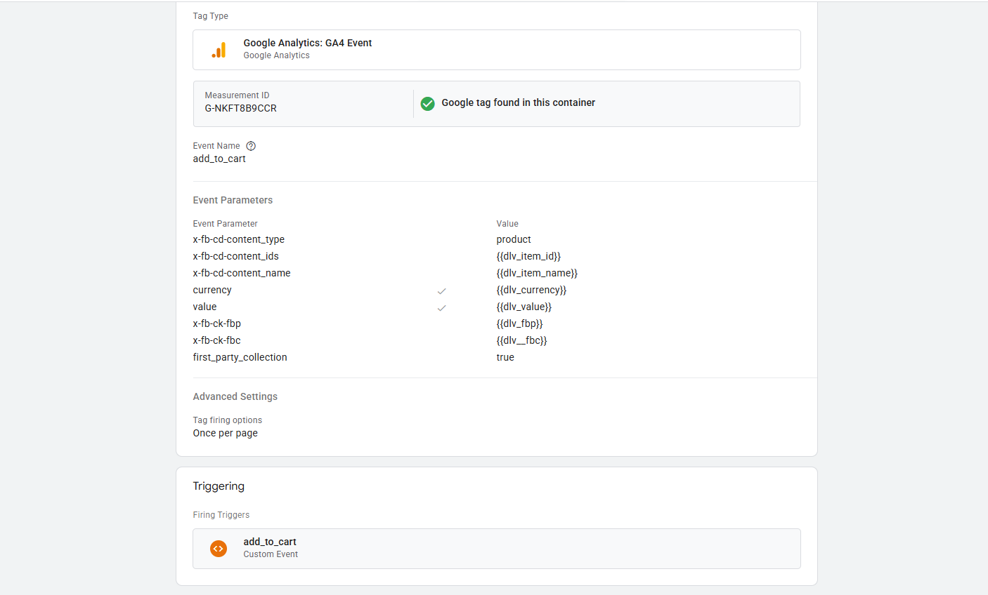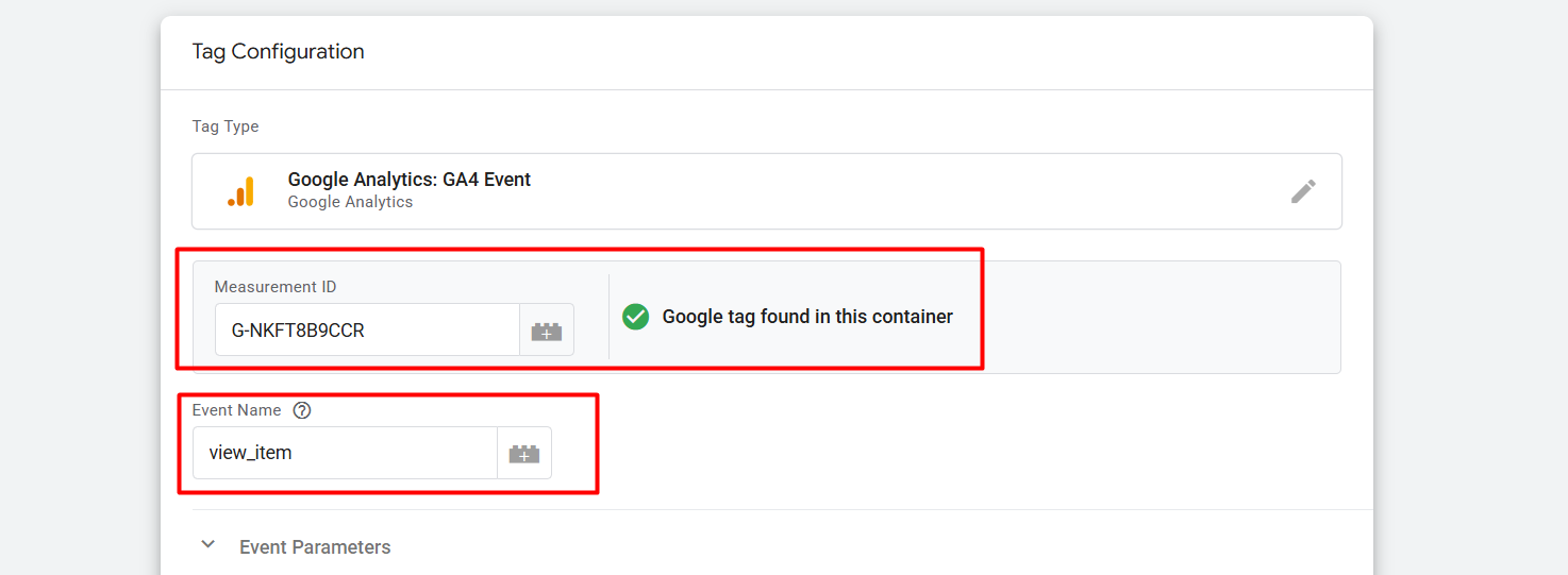 在选择标签后,在“测量 ID”中,我们放入相同的测量 ID,在“事件名称”处,我们放入事件名称。在此,我们正在设置“ViewContent”,但我们必须记住,我们是通过 GA4 发送这些数据的,因此我们必须遵循 GA4 的架构。因为 GA4 在查看一个产品后称之为“view_item”,而不是“ViewContent”。