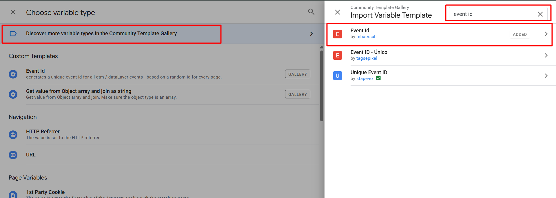 所以从这里,选择搜索并选择“事件 ID”变量模板。现在在变量部分添加了新模板后,您可以将其用作您的变量类型。