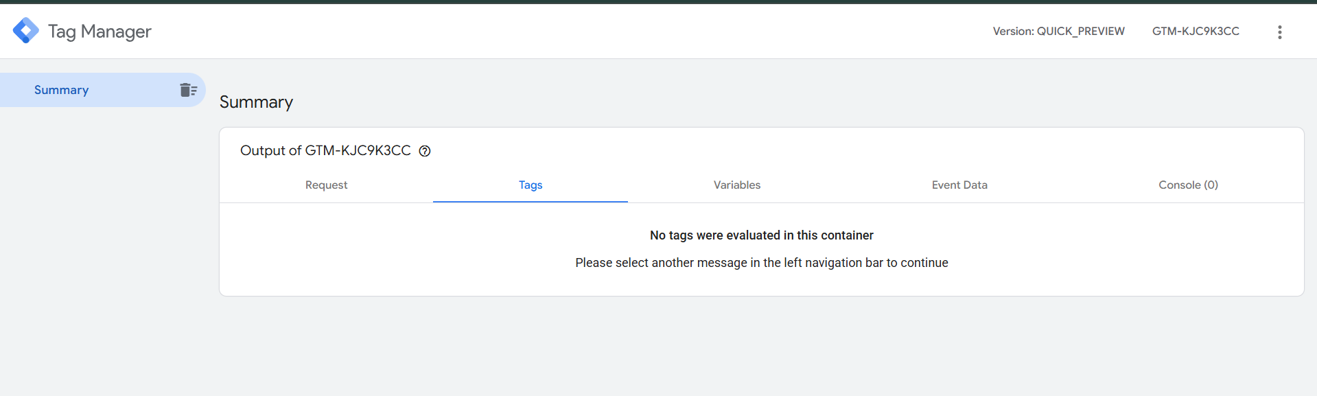 这是从服务器容器打开预览后的第一次视图。现在进入您的 GTM Web 容器,创建一个新的预览并在您的网站上进行一些操作。