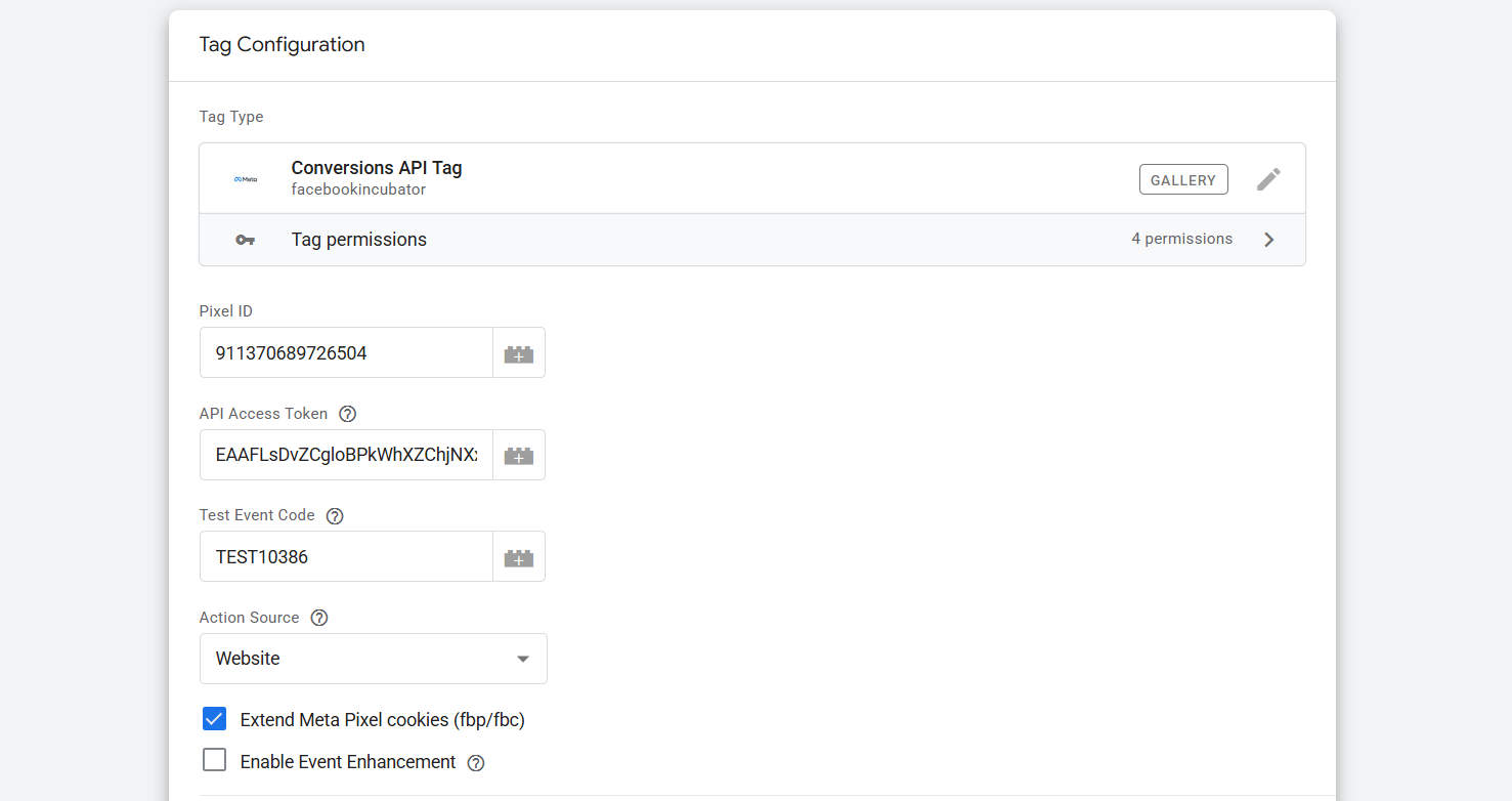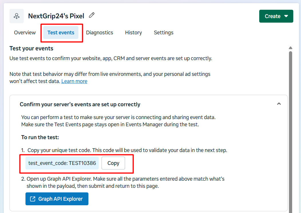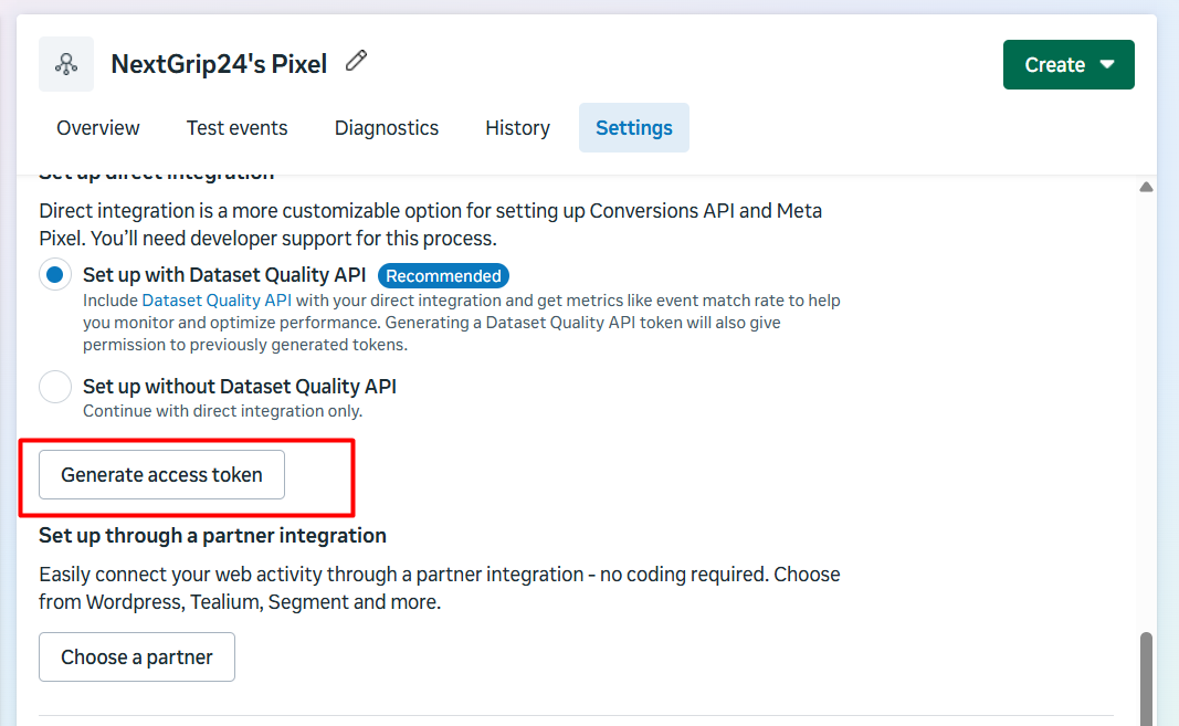 这是您的 Facebook API 视图。为了完成设置,我们需要收集三样东西:一个“访问令牌”、第二个“Facebook 像素 ID”和测试事件代码。