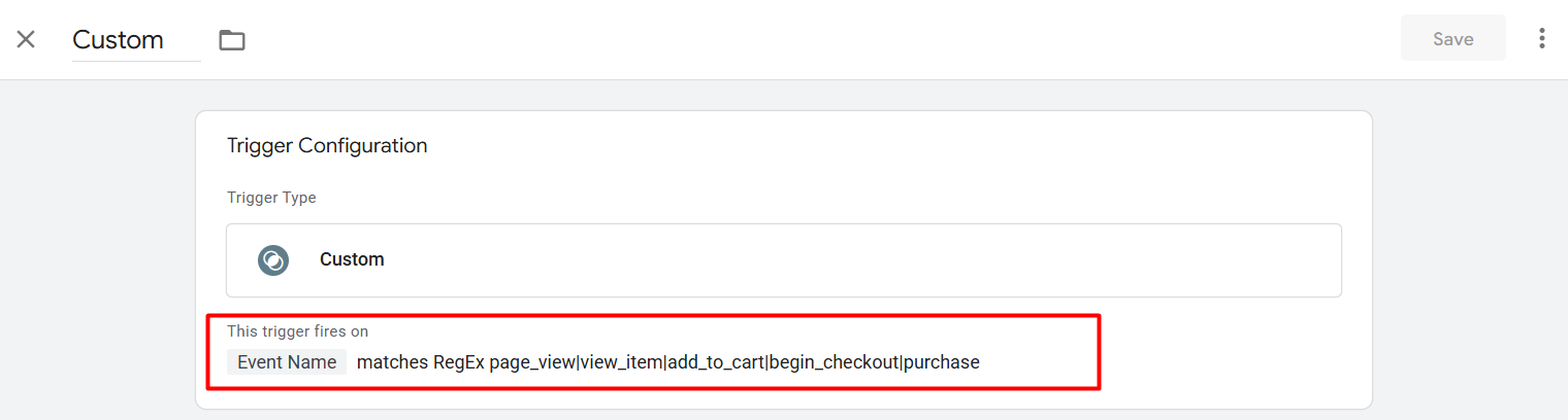 在第二个字段中输入“page_view|view_item|add_to_cart|begin_checkout|purchase”。这个正则表达式指示 GTM 在这些事件发生时启动。因为 | 符号用于分隔不同的事件名称,所以这个触发器会在这些事件中的任何一个发生时激活,使您能够在客户旅程的每个阶段记录操作,从页面查看到购买。