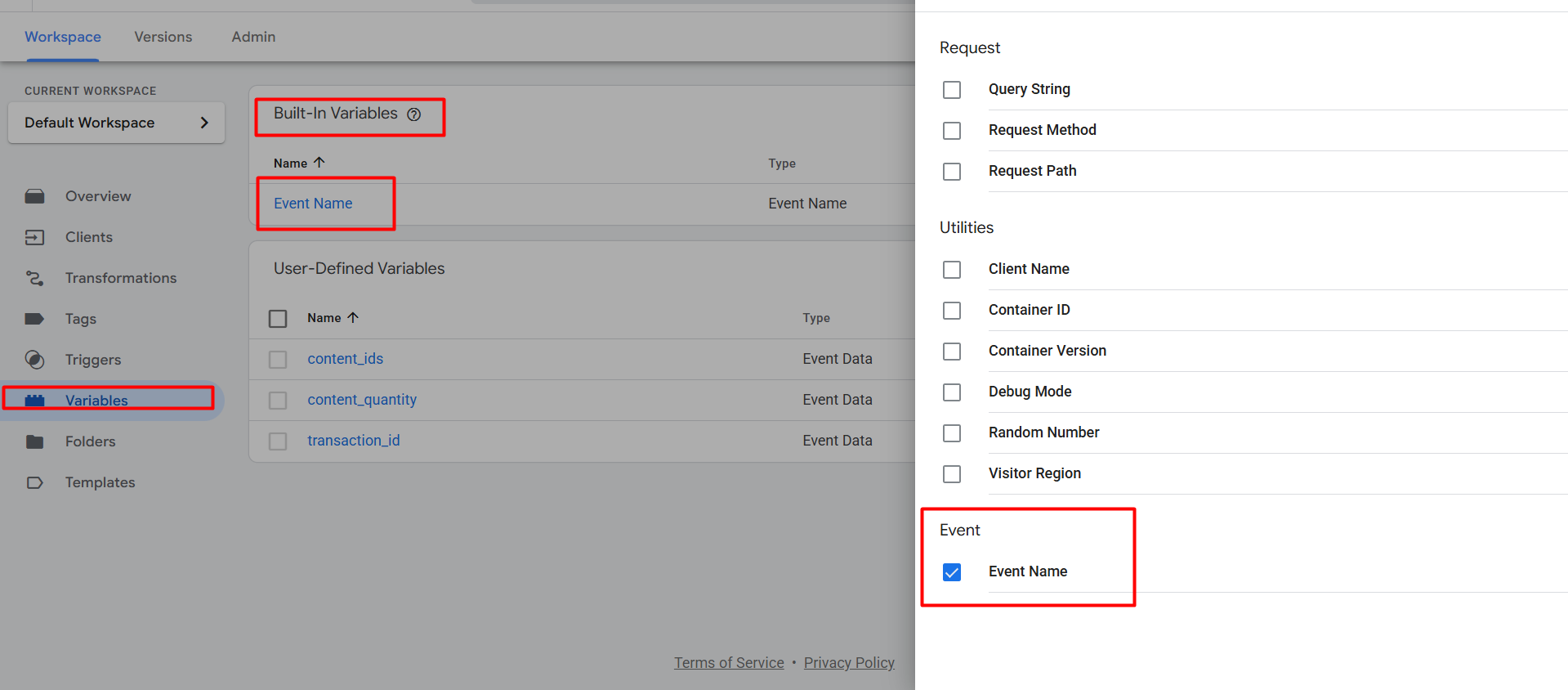 但是,如果在第一个位置找不到“事件名称”,请进入您的变量部分,从内置变量中选择“事件名称”,然后就完成了。