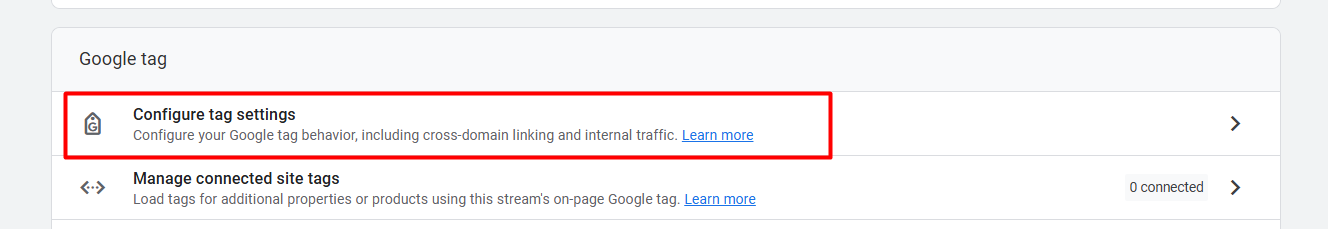 在 GA4 中,我们可以通过多种方式过滤内部流量,但首先需要通过 IP 地址来识别它。要进行设置,请再次进入你的“数据流(Data Stream)”,然后向下滚动找到“配置标签设置(Configure tag settings)”,点击进入下一步。