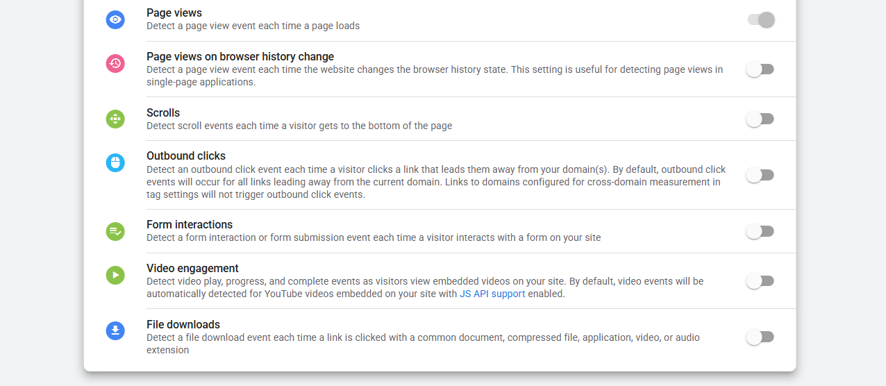 在这里,将所有选项全部关闭。如果我们需要任何类型的事件,我们会通过 Google Tag Manager 以自定义方式来实现。这是完成 GA4 安装后的第二个重要步骤。
