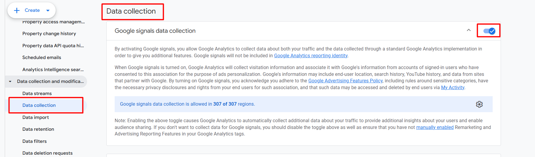 进入该设置后,启用第一个选项“Google 信号数据收集(Google signals data collection)”。