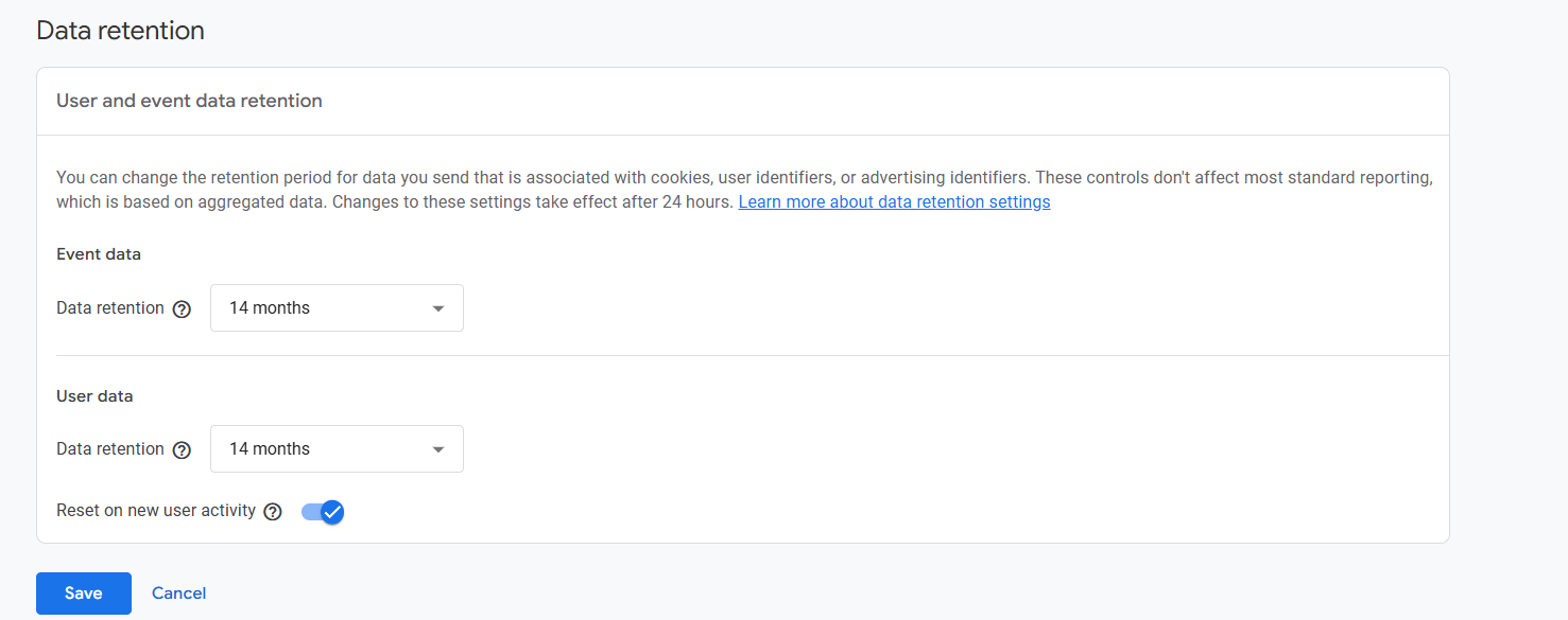 现在在这里,将数据保留期限从 2 个月延长到 14 个月,并保存设置。