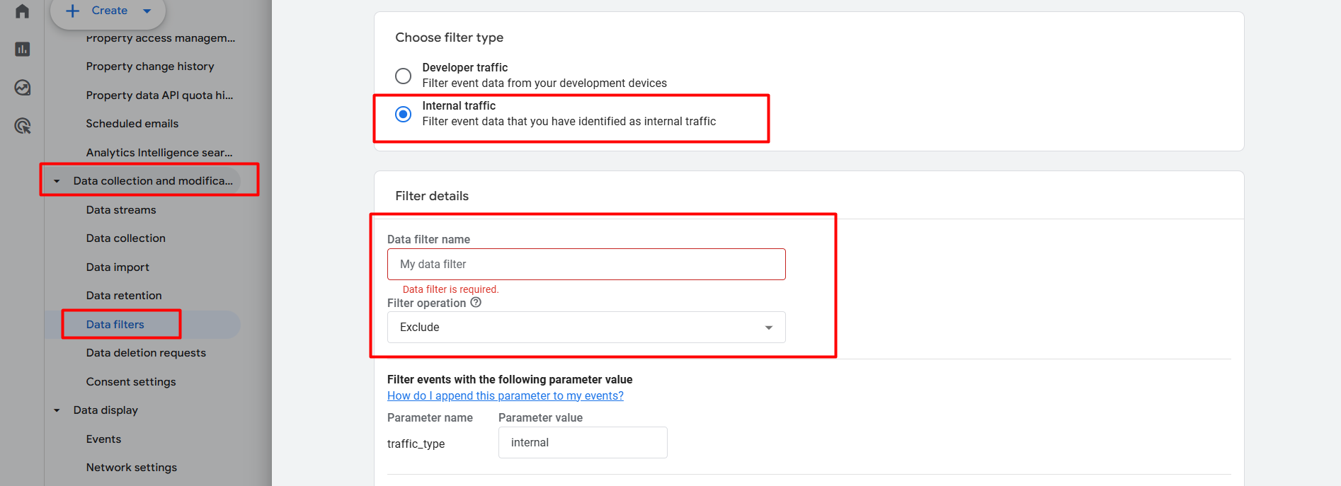 如果你想过滤内部流量,请返回到“数据过滤器(Data filters)”部分。在这里,你可以完成数据过滤的设置。