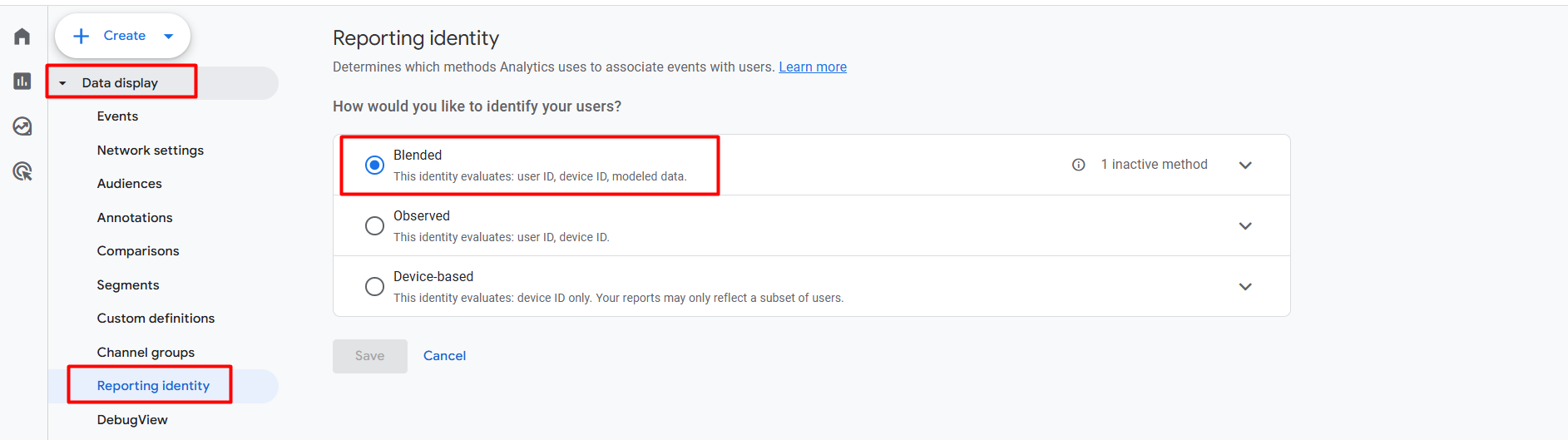 此外,你也可以使用更高级的方式,让 GA4 结合用户 ID、设备以及建模数据来进行识别。要进行此设置,请进入“数据展示(Data display)” > “报告身份(Reporting identity)”。