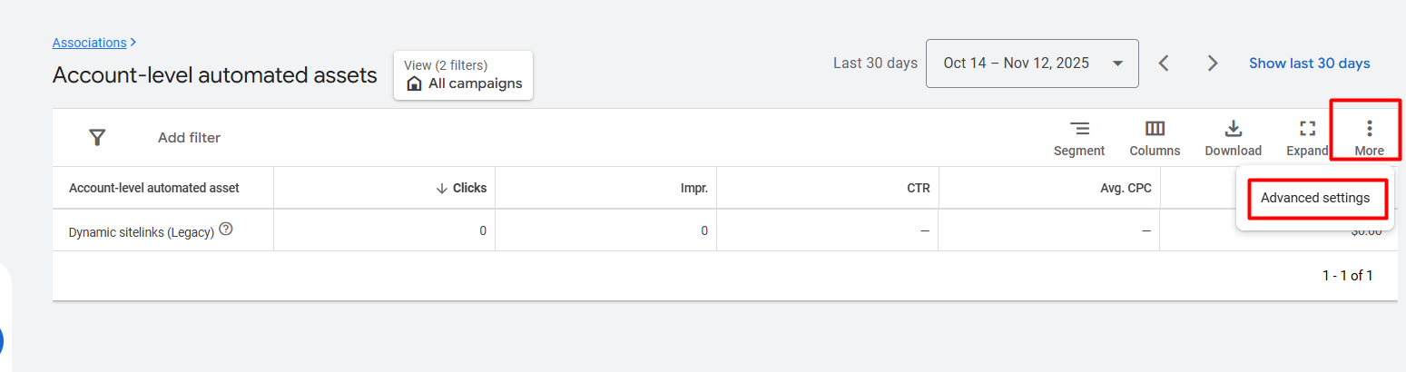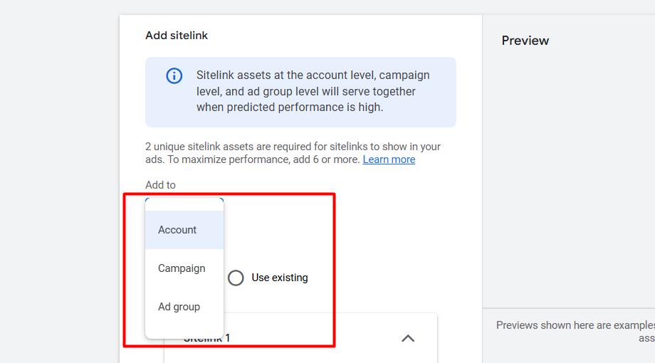 通过附加链接,你可以分享更多关于你产品的信息。因此,如果你想为广告设置附加链接,是可以直接进行设置的;但如果你想在账户层级进行设置,就需要进入广告系列部分,然后在广告系列中进入资产(Assets)部分进行操作。