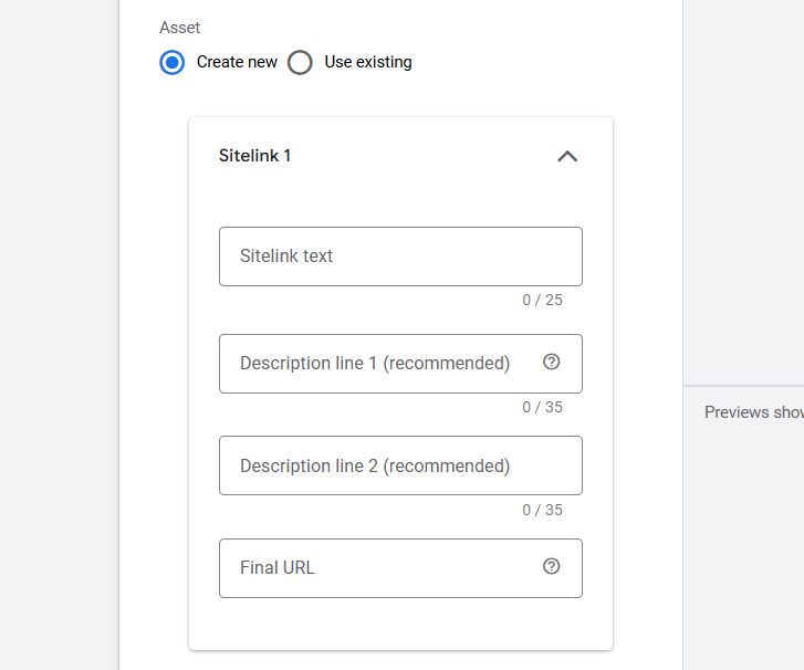 如果你想在广告中使用附加链接,至少需要创建 2 个附加链接,最多可以为广告创建 20 个不同的附加链接。我们通常在广告组层级创建这些附加链接,因为所有附加链接都应该与我们的广告文案相匹配。