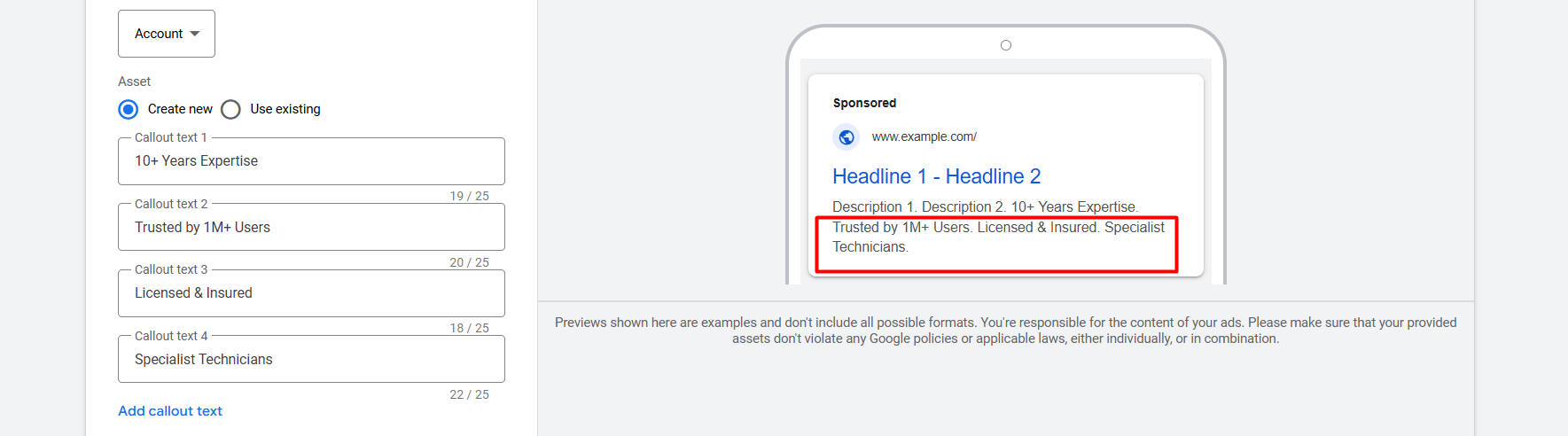 通过宣传附加信息(Callout Extension),我们可以突出品牌的优势或价值。为了向客户说明我们品牌的价值、目标以及优势,我们会使用这种附加信息。由于这些内容通常始终与品牌本身相关,因此我们可以在账户层级进行设置。