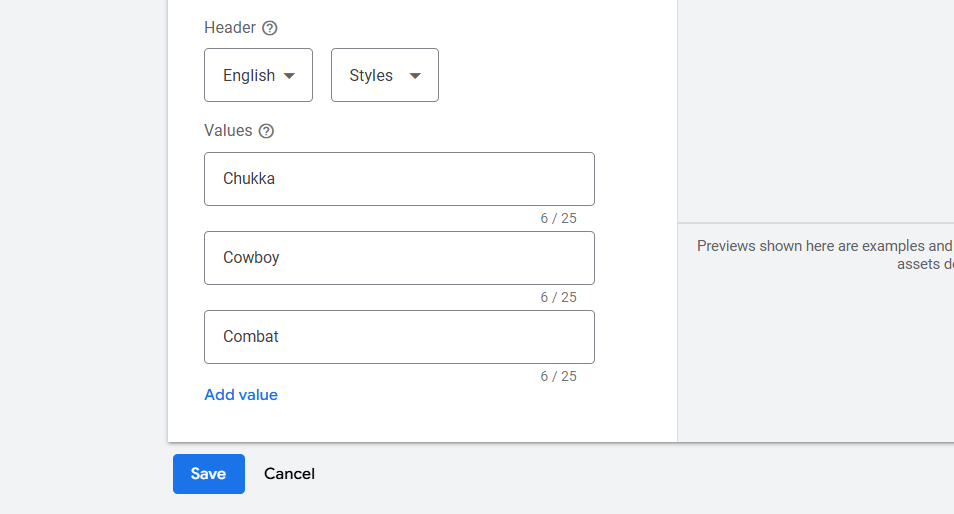 此功能可以让你直接在广告中突出展示你所提供的具体且有用的细节。与其只说你销售“鞋子”,不如使用结构化摘要来列出你提供的类型,例如“运动鞋、靴子、凉鞋和高跟鞋”。