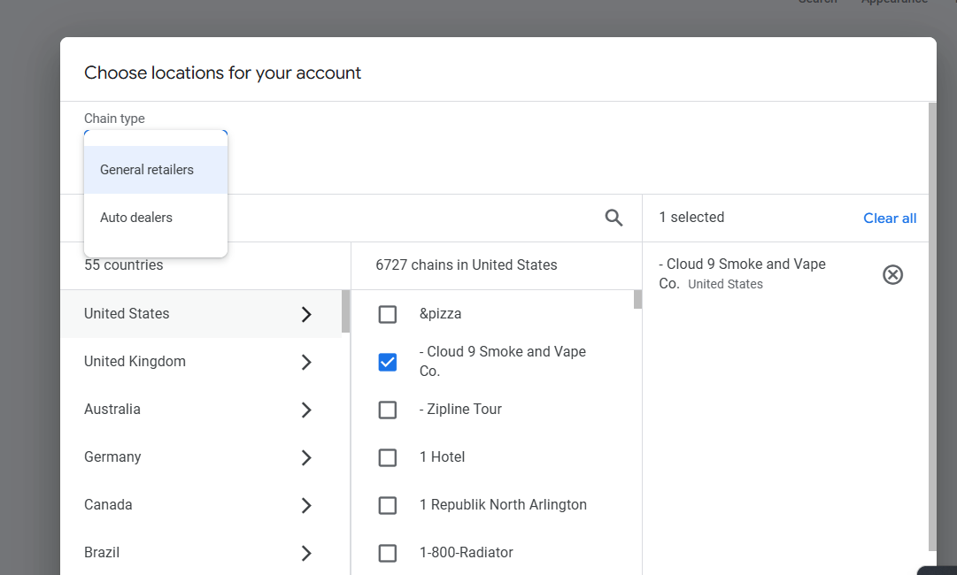 或者,如果我们也有联盟门店位置,也可以选择使用该类型。选择连锁类型和具体位置,然后继续即可。