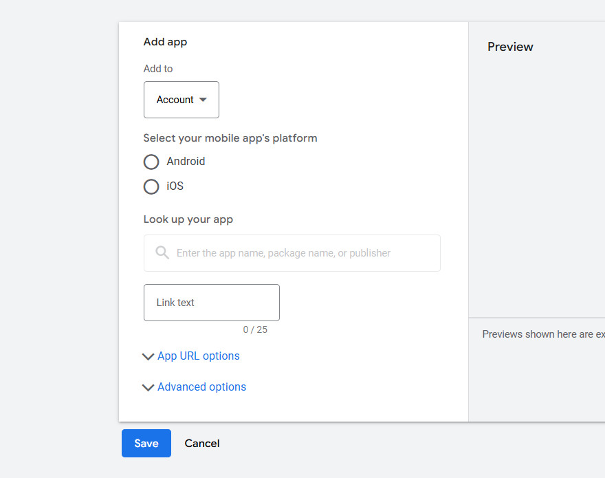 在选择你的应用平台后,你可以搜索并找到你的应用,然后保存以在广告系列中使用。该附加信息可以在账户层级进行设置,因为同一个应用通常会用于所有广告系列。