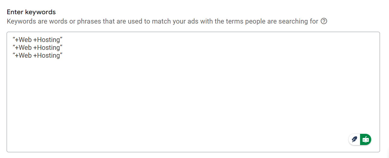 在我们选择的关键词“web hosting”中,必须保持相同的顺序。如果一个关键词只有“web”或只是“hosting”,我们的广告仍然不会展示。如果关键词中“web”和“hosting”没有并排出现,那么也不会生效。