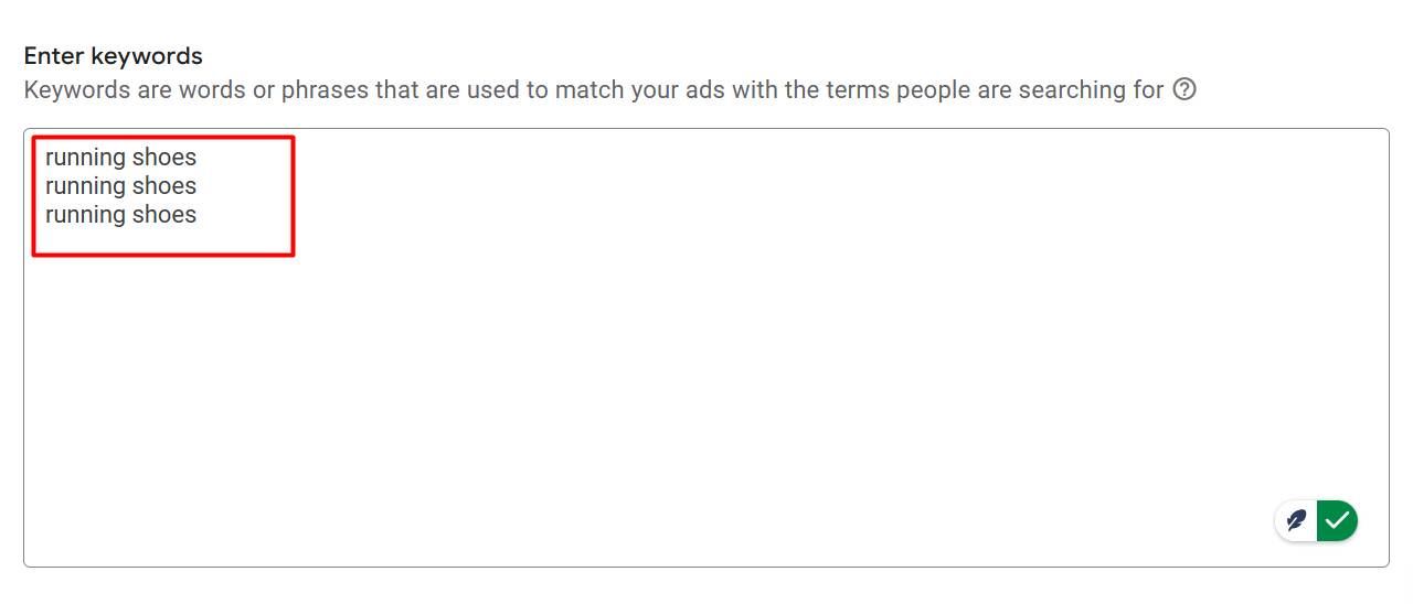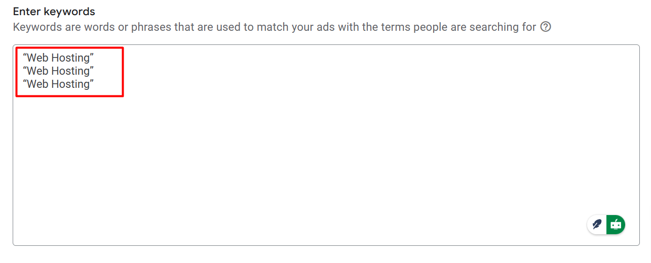 假设这是你为短语匹配选择的关键词,但为了使用这种匹配类型,你需要在关键词前后加上“”符号,然后它就能在短语匹配类型中生效。像这样,你需要在关键词框中输入你的关键词。