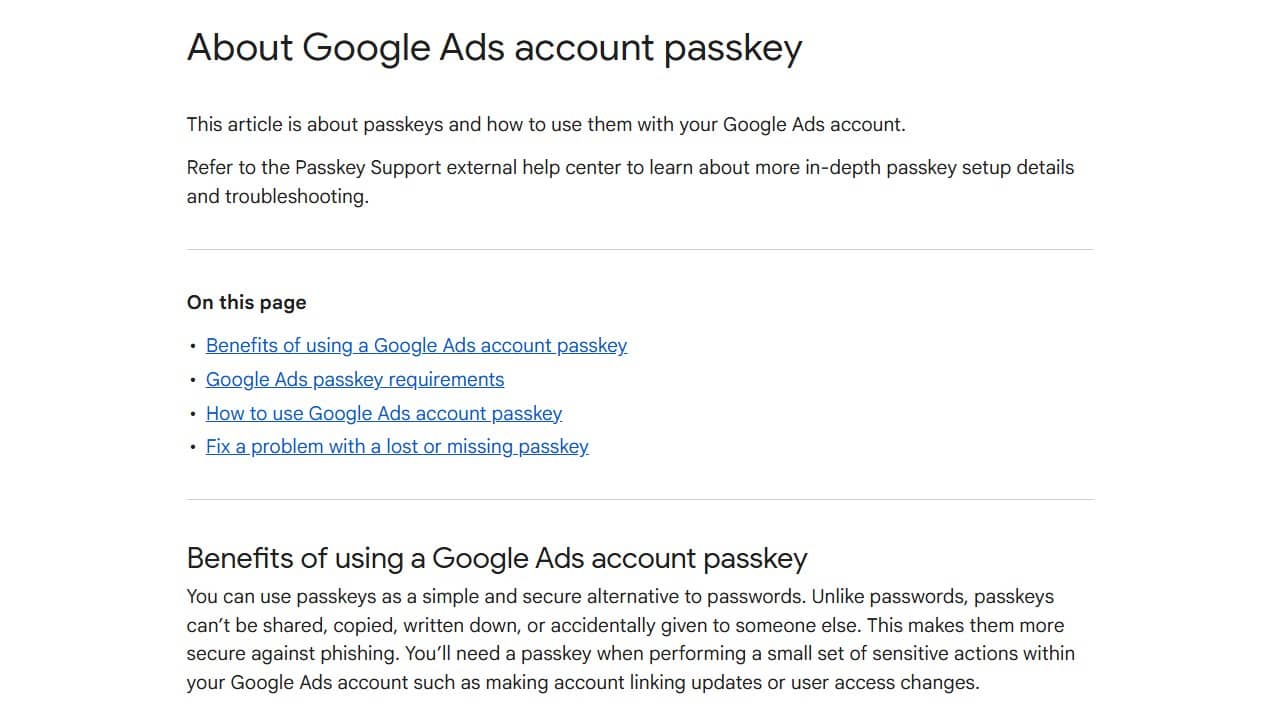 发生了什么?新的帮助页面解释了通行密钥如何作为一种无密码、具备抗钓鱼能力的登录方式在 Google Ads 中发挥作用,并说明了何时必须使用通行密钥——包括进行用户访问权限更改和账户关联更新等敏感操作时。
