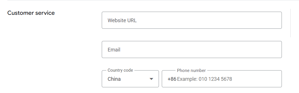在这里,您需要添加您网站的联系页面链接(Contact Page URL),然后填写您的主要商家邮箱地址。接下来,在第三个选项中,您需要填写您的商家电话号码。