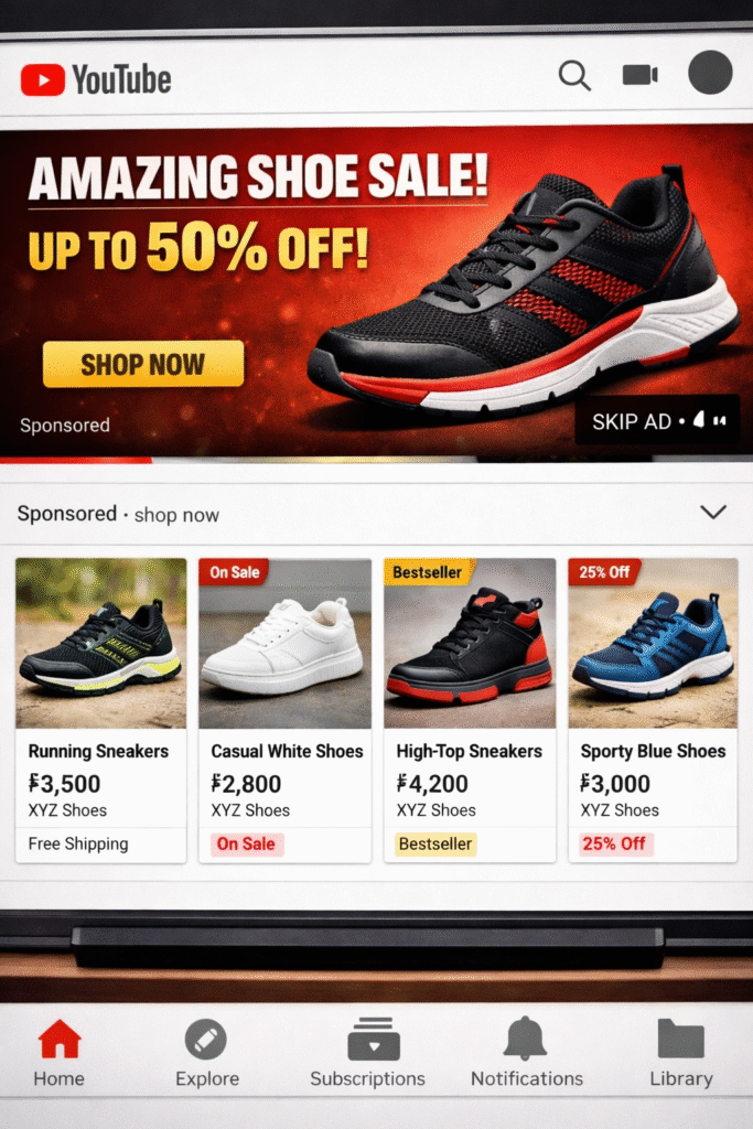 此外,将产品上传到 Merchant Center 还能带来更多好处。每当我们投放展示广告,尤其是 Demand Gen 广告时,都可以在广告的视频或图片下方展示我们的产品。