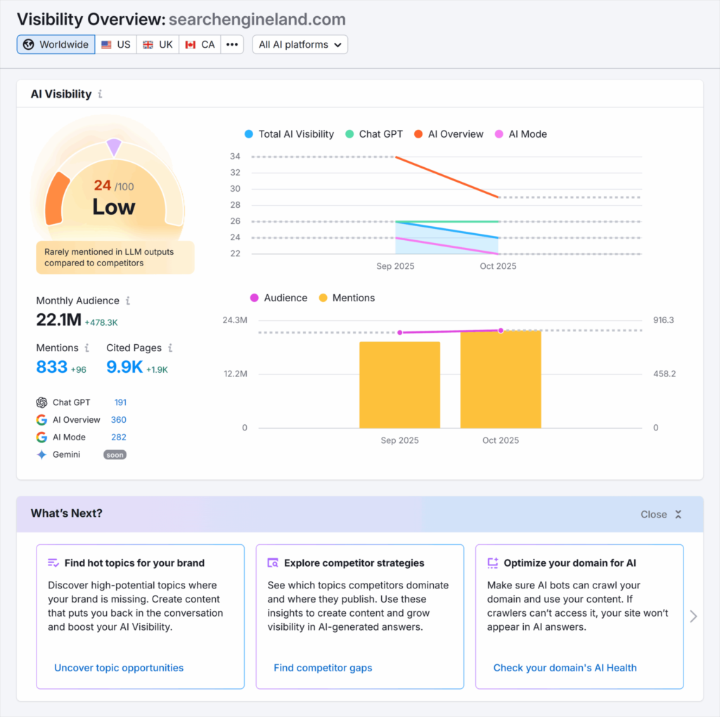 像 Semrush 的 AI SEO 工具包这样的工具,可以让这一过程变得更简单。该工具包可以追踪: