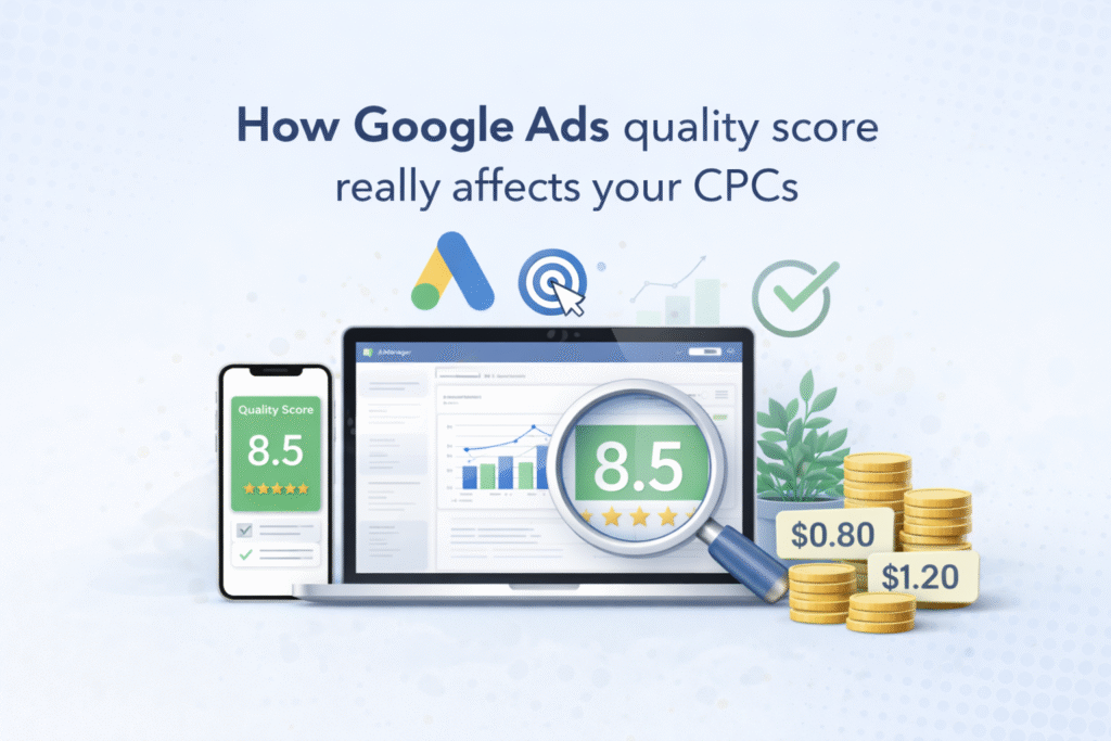 高CPC?低广告质量,而非出价,可能是真正的罪魁祸首——提高你的质量评分能带来更好的结果。 如果你的CPC持续攀升,原因可能不在于你的出价策略、预算,甚至竞争对手。 你可能正面临低广告质量的问题。 让我们来分析一下你 Google Ads 账户中最基础、也是最容易被误解的指标。如果你想停止向 Google 支付过高费用,并开始凭借实力赢得竞标,你需要理解 1 到 10 的质量评分是如何真正起作用的。 质量评分、广告强度和优化评分之间的区别 在我们深入讨论之前,先来澄清一些误解。Google 显示了很多“评分”和“诊断”,你可以放心地忽略其中大部分。质量评分是一个例外。 广告强度是一个广告级别的诊断指标。它检查你的响应式广告是否遵循最佳实践,比如是否有足够的标题和描述。它对竞标表现没有任何影响。优化评分是一个销售指标。它衡量你查看了多少个 Google 推荐。它不反映实际的广告表现。 质量评分是不同的。它是基础性的。这个关键词级别的诊断总结了你的广告质量。它与出价一起决定了广告排名。广告排名决定了你的广告是否显示、在搜索结果页的哪个位置显示,以及每次点击的费用。公式很简单:广告排名