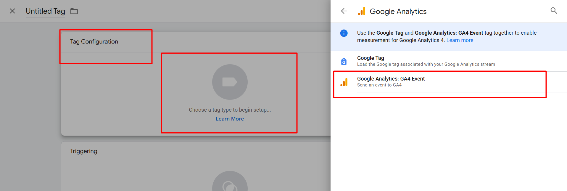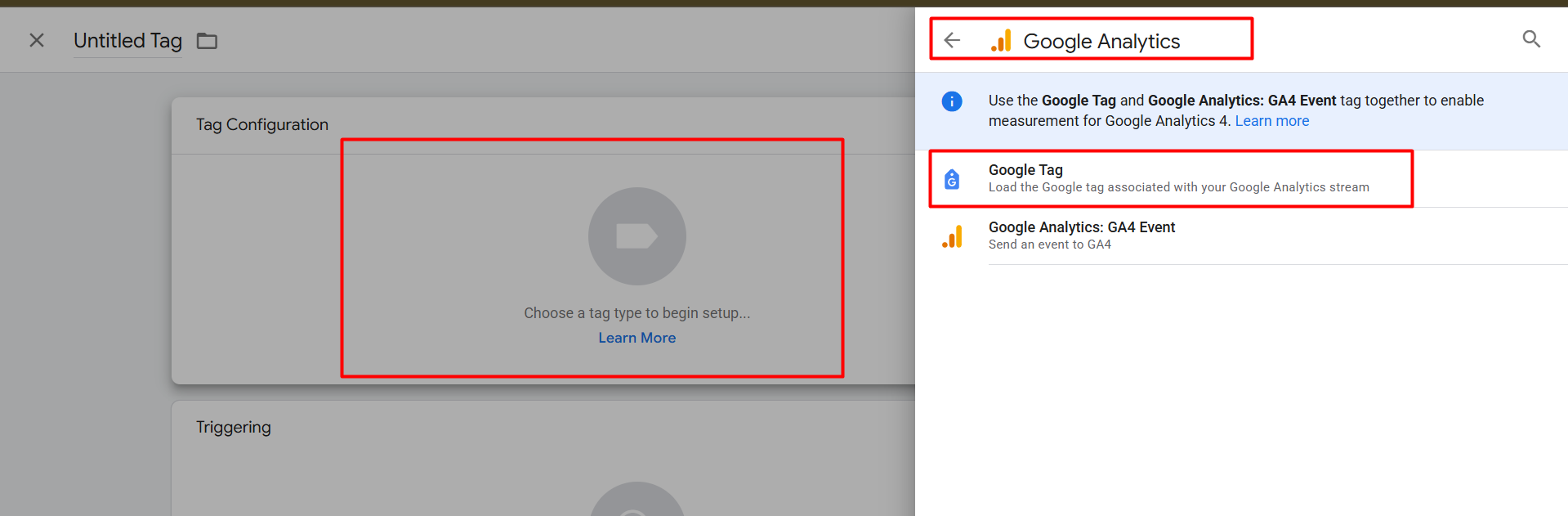 首先,进入GTM中的标签部分,创建一个新标签,但这次在标签类型中,选择‘Google Tag’作为标签类型。