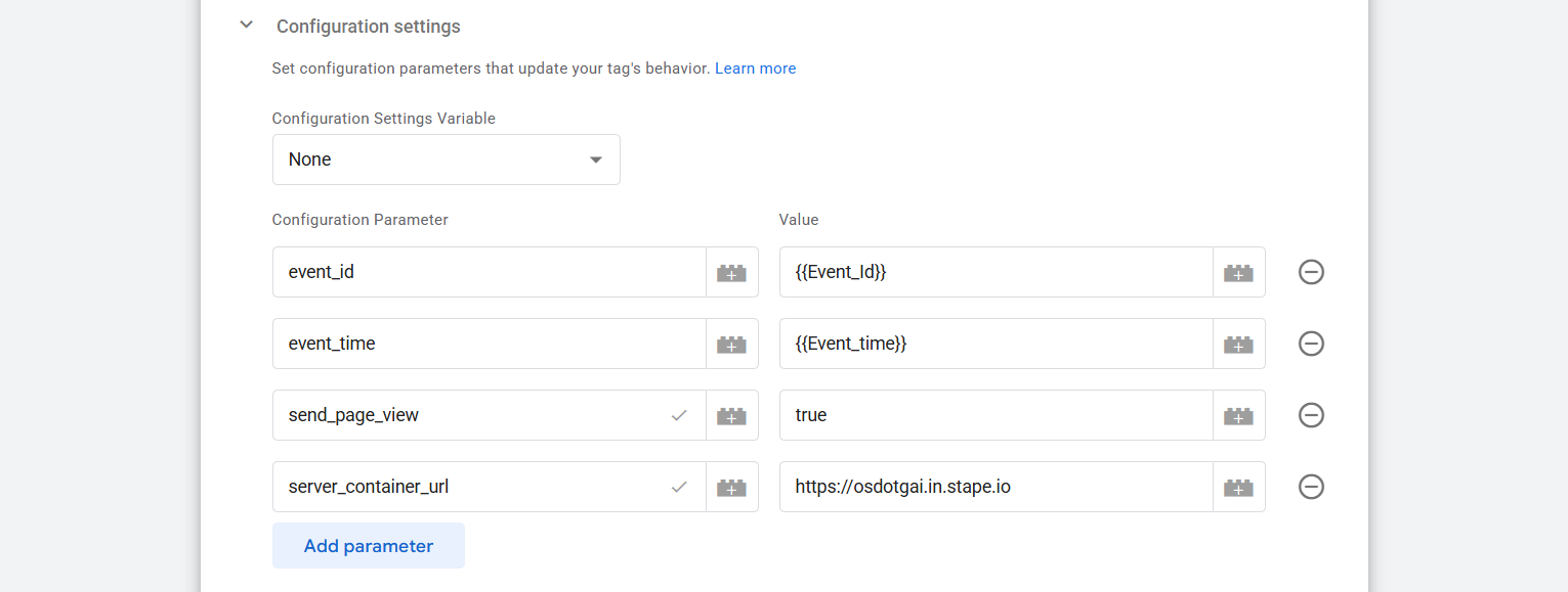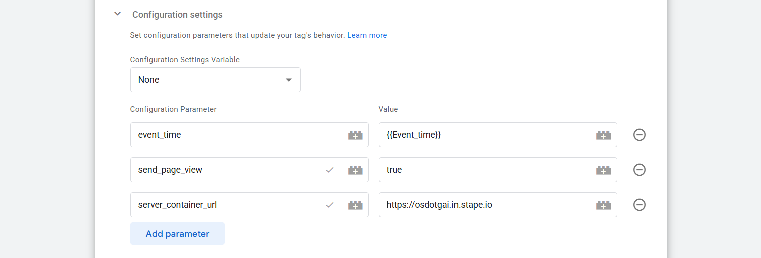 现在在‘配置参数’位置,我们添加了三个参数。你可以记得,在浏览器端跟踪中我们没有使用任何单一参数。但在服务器端,我们必须这么做。