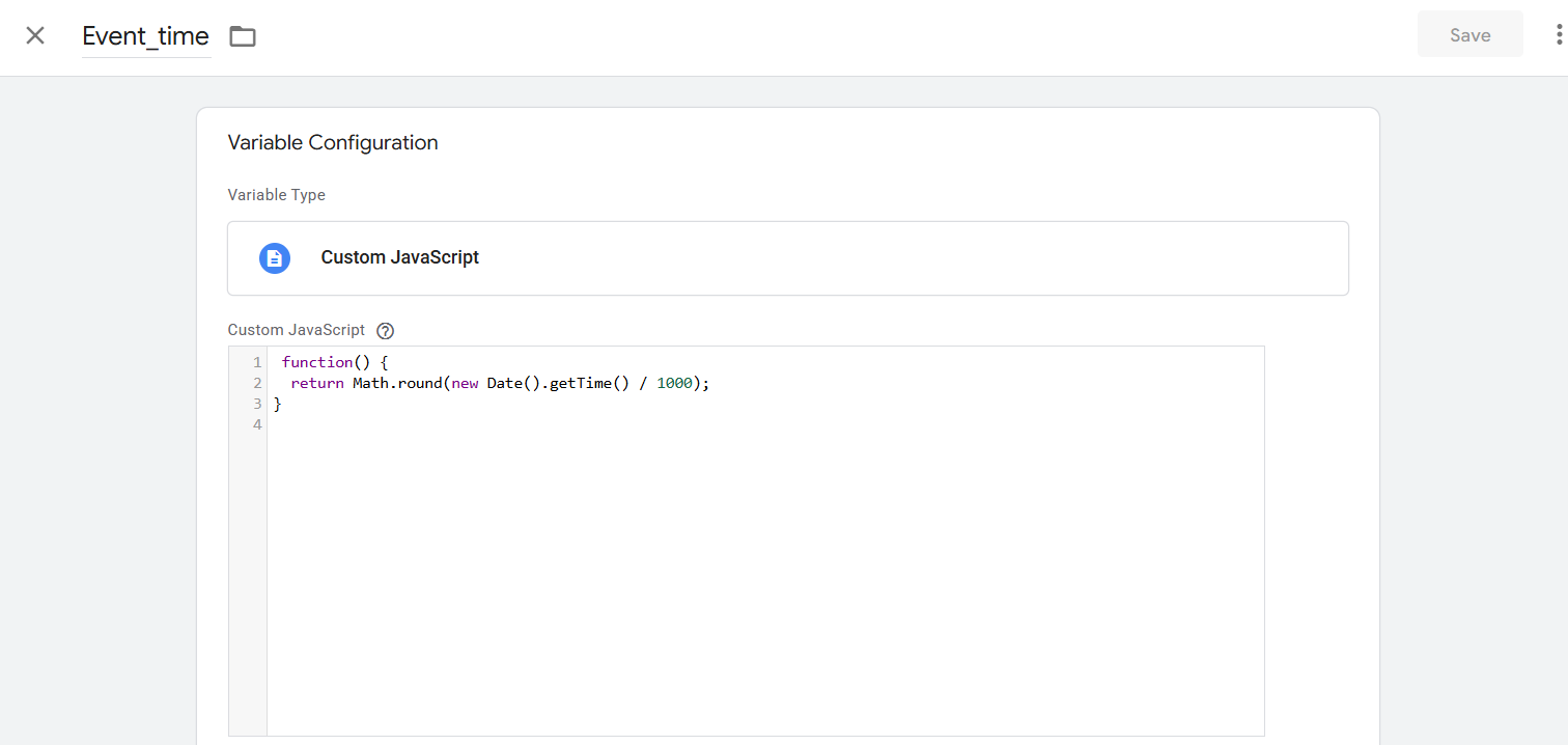 要创建这个变量,首先进入变量部分,从用户定义的变量中创建一个新变量。选择‘自定义JavaScript’作为触发器类型。然后粘贴代码并保存变量,以便在这里使用。