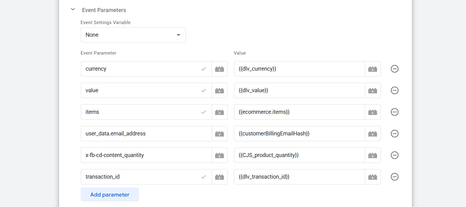 现在这是我们必须发送到服务器的最终事件。这个标签的跟踪方式也相同,但对于这个事件,我们需要发送一些新的参数。通过所有这些新参数,我们还必须发送一些用户信息。我们将在数据层完成一次购买后获取所有这些信息。