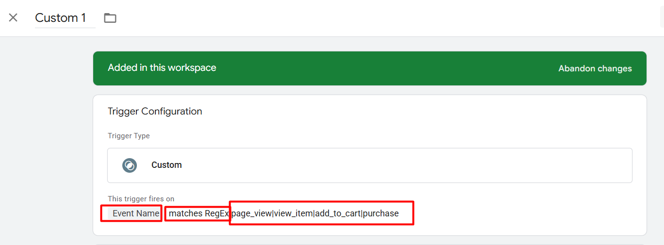 在第二个字段中输入‘page_view|view_item|add_to_cart|purchase’。这个正则表达式指示GTM在任何这些事件发生时启动。因为‘|’符号用来分隔不同的事件名称,所以这个触发器会在这些事件中的任何一个发生时激活,使你能够在客户旅程的每个阶段(从页面浏览到购买)记录动作。