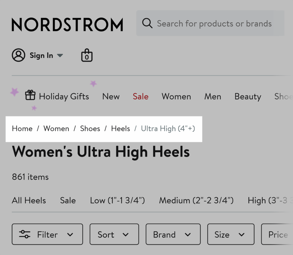 示例:Nordstrom 在其服装搜索中广泛使用基于属性的面包屑。例如在搜索超高跟鞋时,可能会显示:“首页 > 女士 > 鞋类 > 高跟鞋 > 超高(4 英寸以上)