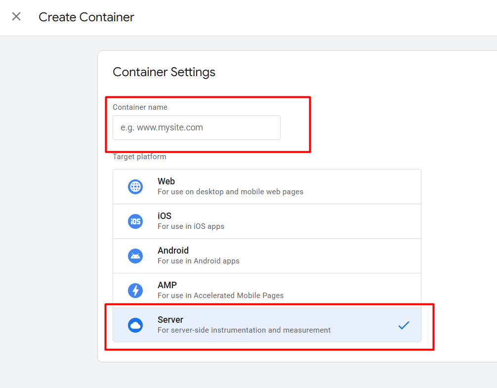 在新页面中点击“+”图标后,输入您的容器名称,并选择“服务器”部分。