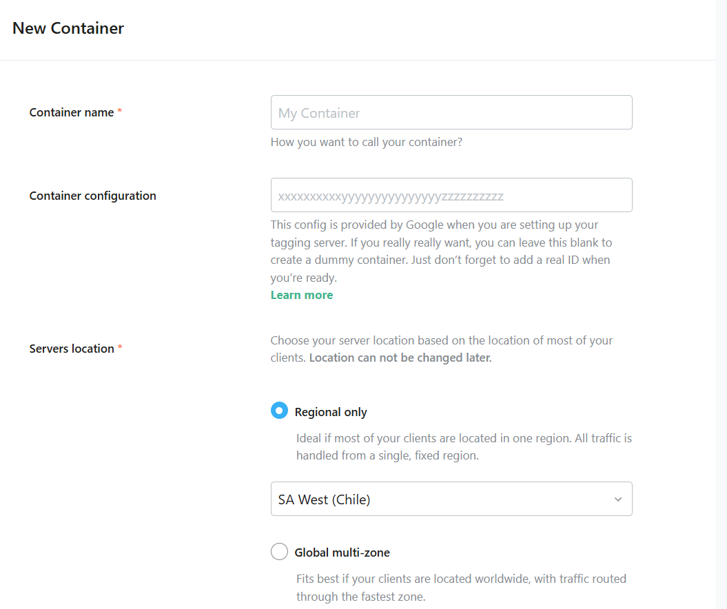 在容器名称处,请输入您想要的名称,对于“服务器位置”,请选择服务器。但在选择服务器之前,您需要了解您的客户所在的位置;尽量选择最近的服务器。