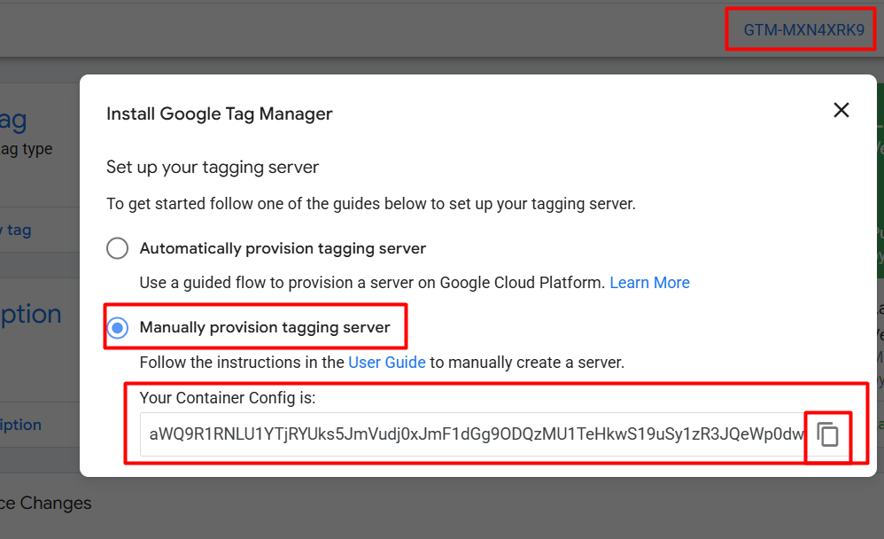 选择“手动配置标签服务器(Manually Provision Tagging Server)”,复制代码,并粘贴到“容器配置(Container Configuration)”的位置。然后点击“创建容器(Create Container)”。