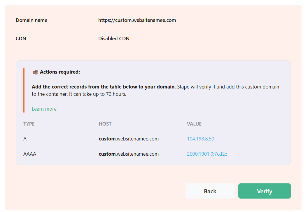 在开发人员的帮助下,你现在可以将这两个记录添加到你的 DNS 中,就完成了。添加完这两个值后,你需要进入 stape.io,并点击 “Verify” 按钮来验证新的自定义域名。
