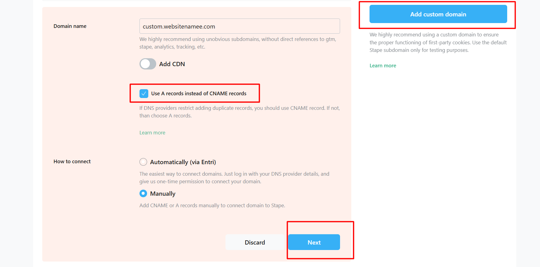 我们使用“A记录(A Record)”而不是CNAME的原因是,A记录直接指向IP地址,这可以为我们的服务器端设置提供更好的控制和稳定性,确保与Stape的集成更加顺畅,并实现更可靠的性能。