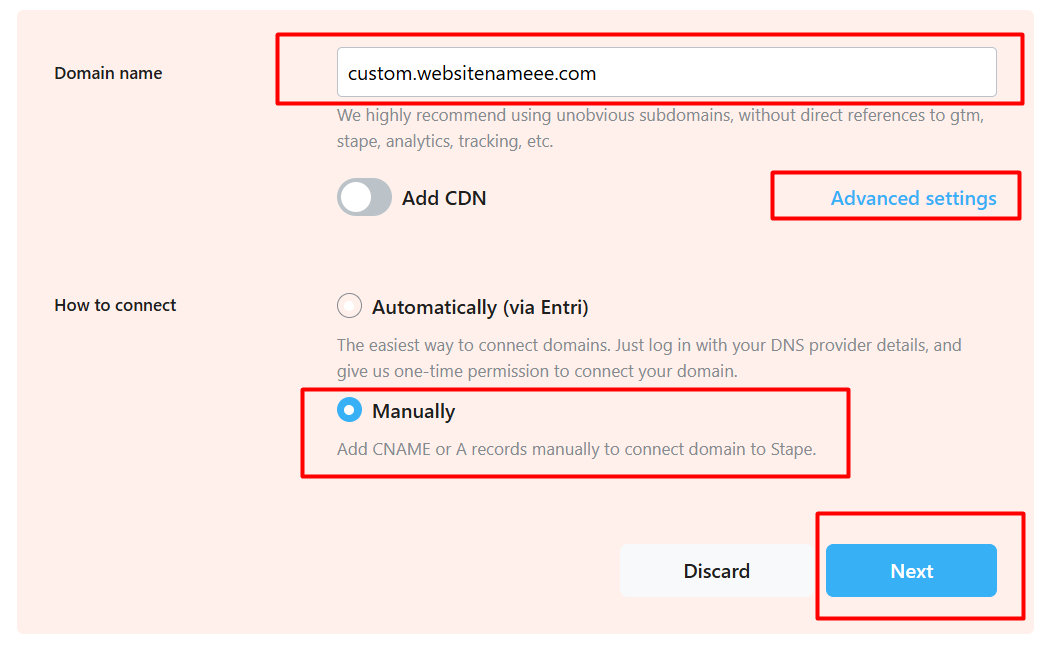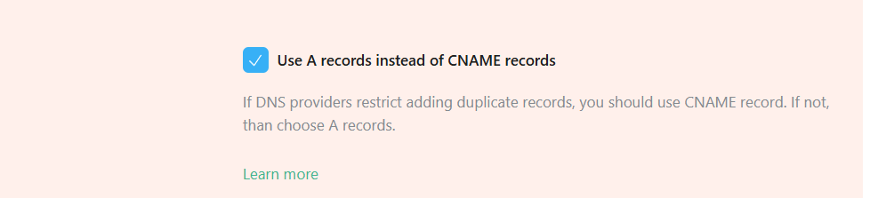 点击“添加自定义域名(Add Custom Domain)”后,您会看到这个选项。虽然您可以使用CNAME方法,但我们将使用“A记录(A Record)”。要访问此选项,请点击“高级设置(Advanced Settings)”。